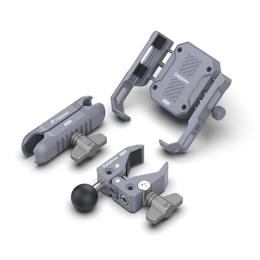 The Handlebar Mount Kit combines modular components from Outplorer's suspension mount ecosystem to create a simple yet mount configuration that allows a smartphone to be attached to the handlebars of all bicycles and motorcycles. The smartphone holder incorporates air-suspension technology to provide superior shock-absorption capabilities to reduce potential damage to the phone from exposure to high-frequency vibrations for extended periods. The included handlebar clamp has a jaw capacity of 0.5 to 1.7" so it can attach to virtually any size handlebars. It has a durable aluminum construction with rubberized jaws to provide a secure hold without marring surfaces. It features a cold shoe accessory mount, a 3/8"-16 threaded mount, and two 1/4"-20 mounts that can be used to build a custom setup to suit your cycling needs and vision.
